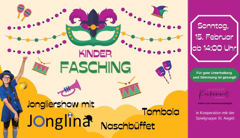 Die Spielgruppe St. Aegidi und der Kirchenwirt laden alle Kinder und Ihre Familien und Freunde zu einem lustigen Faschingsprogramm mit Naschbuffet und einer Tombola ein. Mit dabei ist außerdem JOnglina mit ihrer außergewöhnlichen Jongliershow.